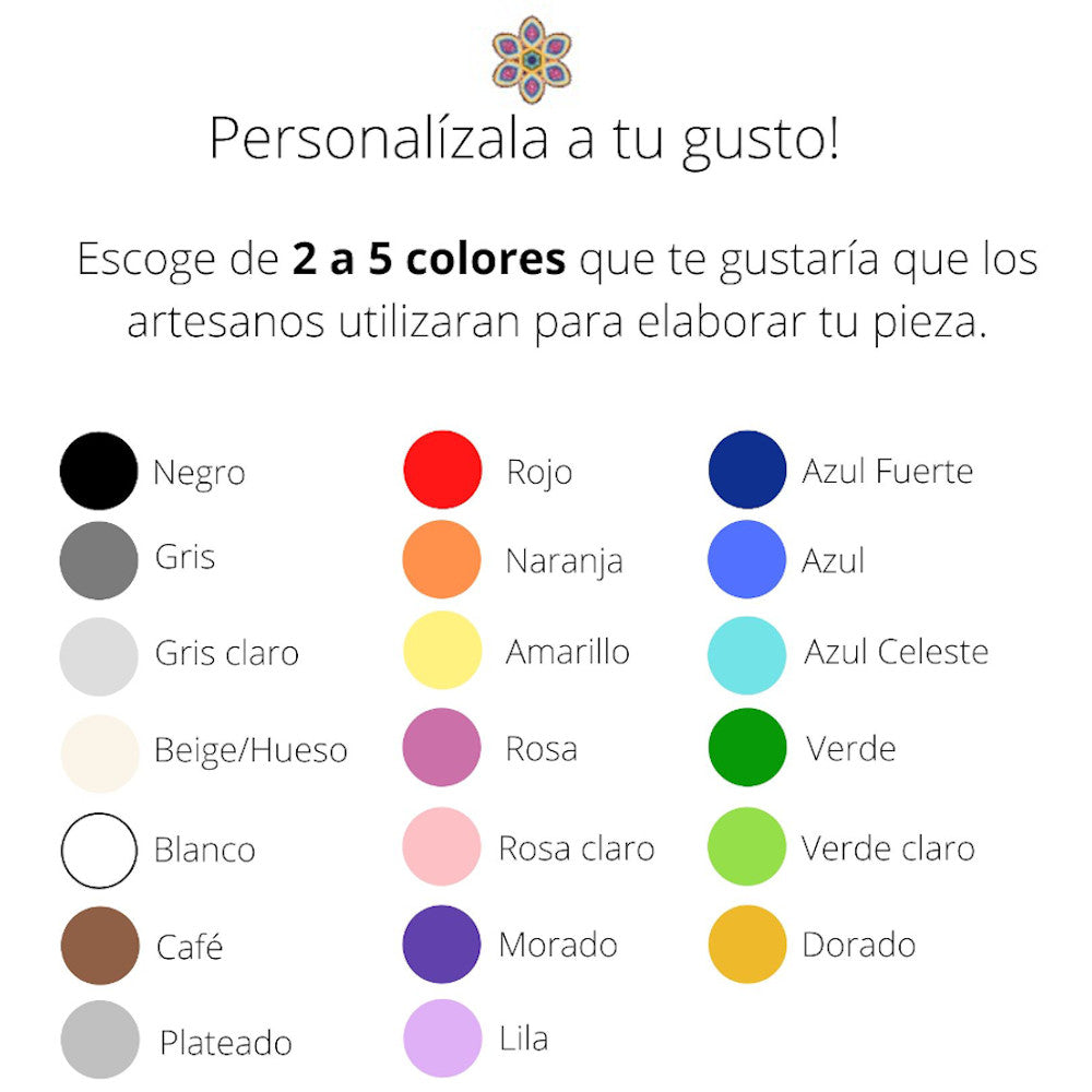 El artesano se va a basar en los colores de tu elección, sin embargo puede diferir a la de las fotos mostradas debido a que cada pieza es ÚNICA y su simbología y diseño varían según la creatividad del artesano.